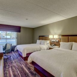 Hotel seems to have been remodeled. Everything, counters, faucets and showers seem new. The shower is very roomy and has flooring which is textured thus keeping old folks like me from slipping. I had an adjacent room to my daughter with connecting doors. Very handy. They staff are friendly and welcoming. The main desk only has one person on duty at one time. Should have two during rush hours. The breakfast is typical Hampton Inn with kids asking their parents to make waffles for them. Scrambled eggs, sausage, cereal, bagels and toast. They discontinued fresh cut up fruit as well as boiled eggs. Two computer terminals were available. If you take afternoon naps beware. At such time squadrons of fighter jets fly by from the nearby Marine Air station. Everything was fine and as mentioned the rooms have a new sleek look.